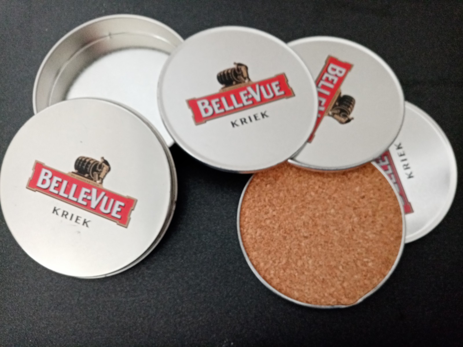 Boîte en métal comprenant 4 sous-verre 'BelleVue'.Composition: métal et liègeLa Kriek BelleVue était une bière Bruxelloise reprise par le groupe AB Inbev leader mondial qui a décidé d'arrêter la production de celle-ci.